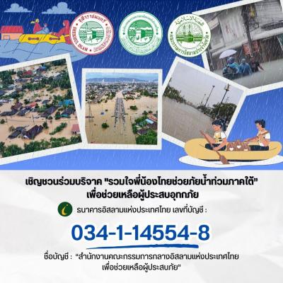 The Chularatchamontri, the Central Islamic Council of Thailand, and the Provincial Islamic Committees throughout the Kingdom invite you to join in the "United Hearts of Thais to Help the Southern Flood Victims" donation drive. 2025-12-01 -