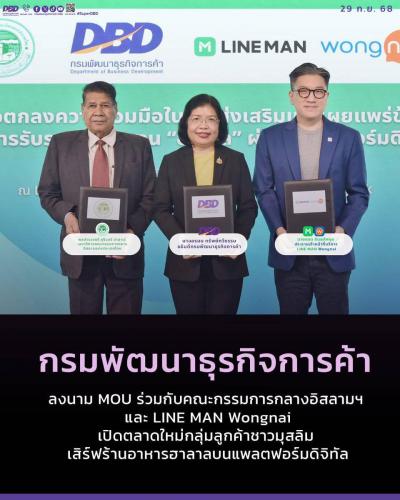 กรมพัฒนาธุรกิจฯ ลงนาม MOU ร่วมกับคณะกรรมการกลางอิสลามฯ และ LINE MAN Wongnai เปิดตลาดใหม่กลุ่มลูกค้าชาวมุสลิม เสิร์ฟร้านอาหารฮาลาลบนแพลตฟอร์มดิจิทัล 30 ก.ย. 2568