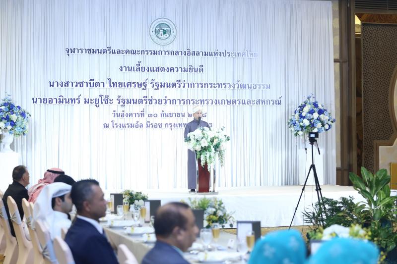 วันอังคารที่ 30 กันยายน 2568 เวลา 19.00 น. จุฬาราชมนตรี และคณะกรรมการกลางอิสลามแห่งประเทศไทย จัดงานเลี้ยงแสดงความยินดี เนื่องในโอกาสที่ นางสาวซาบีดา ไทยเศรษฐ์ ได้รับพระบรมราชโองการโปรดเกล้าฯ ให้ดำรงตำแหน่งรัฐมนตรีว่าการกระทรวงวัฒนธรรม และ นายอามินทร์ มะยูโย๊ะ ได้รับพระบรมราชโองการโปรดเกล้าฯ ให้ดำรงตำแหน่งรัฐมนตรีช่วยว่าการกระทรวงเกษตรและสหกรณ์