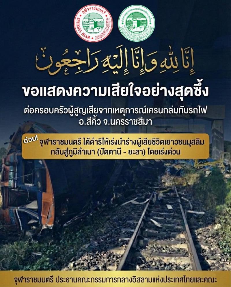 ด้วยความห่วงใยจาก ท่านจุฬาราชมนตรี (อ.อรุณ บุญชม), ท่านเลขาธิการฯ (พล.ต.ต.สุรินทร์ ปาลาเร่) และคณะกรรมการกลางอิสลามแห่งประเทศไทยทุกท่าน ได้เข้าดูแลรับผิดชอบค่าใช้จ่ายทั้งหมดในการส่งศพผู้เสียชีวิตจำนวน 5 ท่าน กลับไปประกอบพิธีทางศาสนา ณ บ้านเกิด